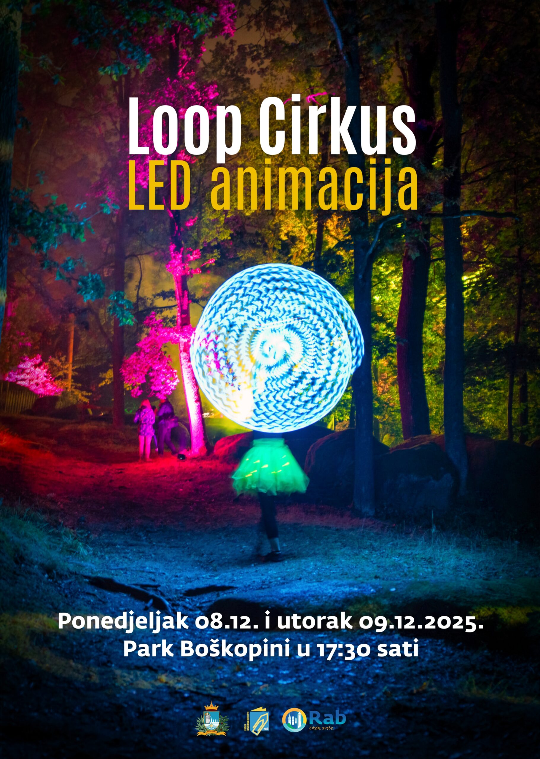 U organizaciji Pučkog otvorenog učilišta Rab te pod pokroviteljstvom Grada Raba, u ponedjeljak 08. prosinca i utorak 09. prosinca održat će se LED animacija pod nazivom “LED Krijesnice” u izvedbi Loop Cirkusa u Parku Boškopini s početkom u 17:30 sati.